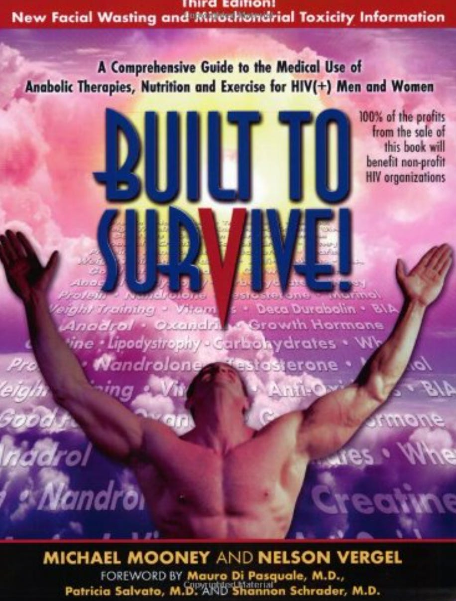 None whatsoever. That's when I realized, oh my God, I need to tell everyone about this, people who were dying and losing weight and afraid of being stigmatized because of their appearance. So, with my own money, I put together a program and started lecturing, mostly at HIV support groups at different nonprofits. Then I got a fax machine and a pharmaceutical rep gave me a list of HIV doctors' fax numbers throughout the U.S., which made me even more efficient. And doctors started prescribing testosterone because, with their AIDS patients, there was nothing to lose. Then in 1999 I published a book, Built To Survive: A Comprehensive Guide to the Use of Anabolic Steroids, Nutrition and Exercise Therapy for HIV Therapy.