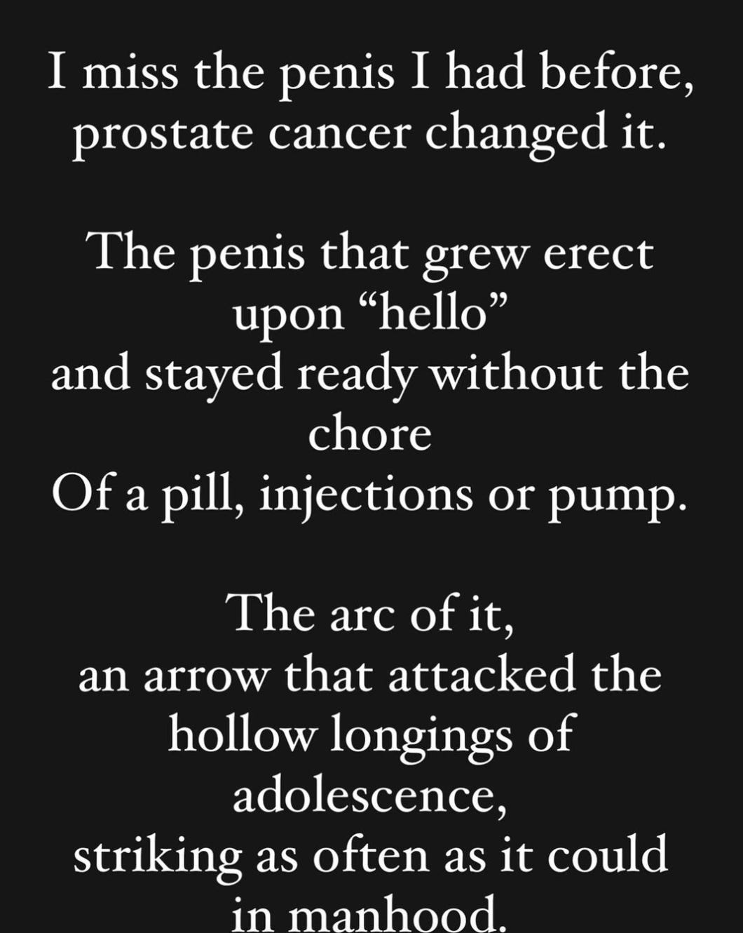 After the surgery, I had to start taking Cialis right away, to tell my penis to get erections. I didn't know that our morning erections play a function in penis health, because they bring blood and oxygen into that tissue, and that if the penis doesn't get that, it atrophies.