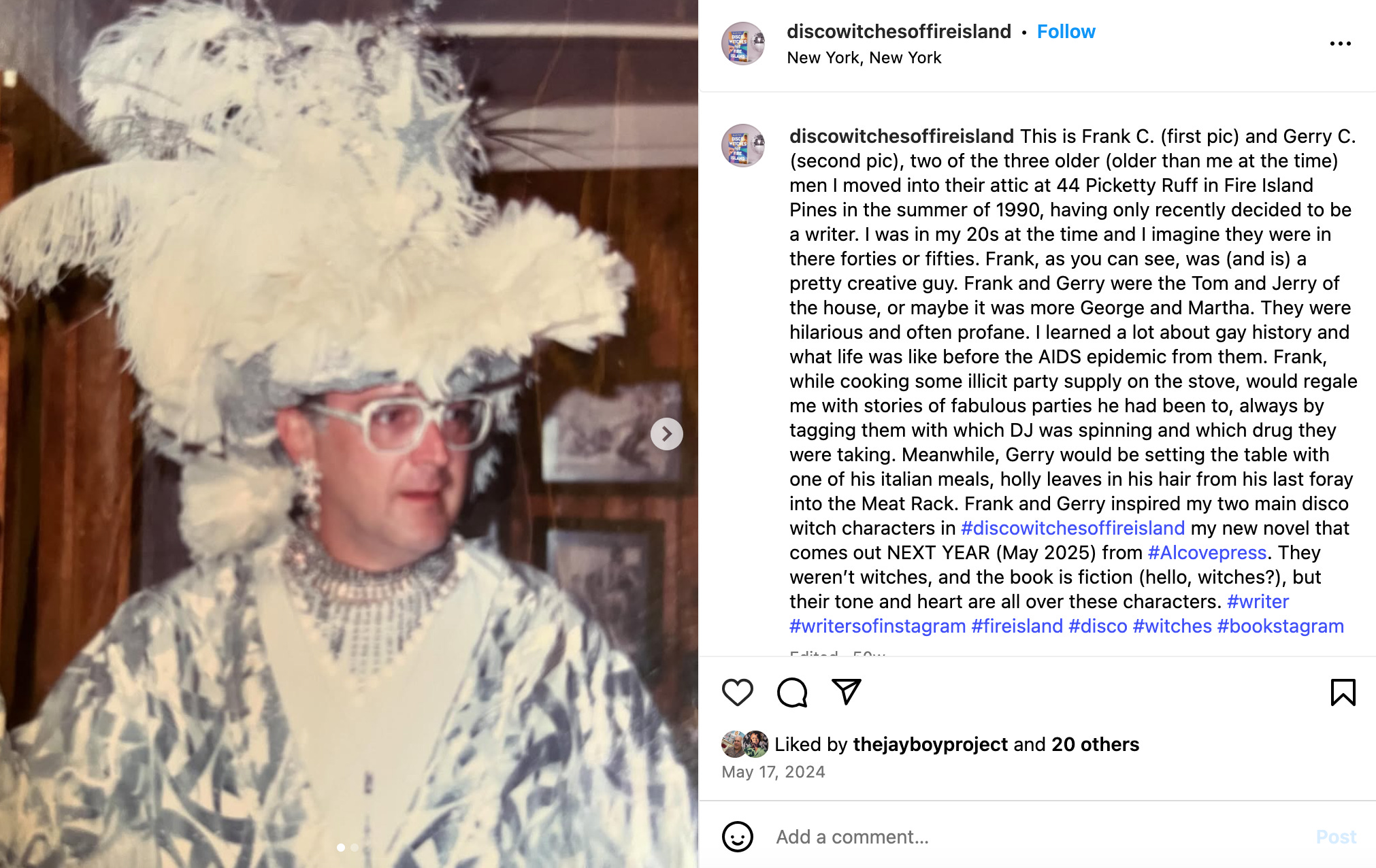 In the same decade, Blair wrote a serialized gay soap opera that would perform live weekly at the (also late, great!) East Village gay hole in the wall Crowbar. It was called “Burning Habits,” in part because it was about nuns (LOL), and it introduced me early on to Blair’s comic and narrative genius. Which is on FULL DISPLAY in his new novel Disco Witches of Fire Island, which I can say with confidence (and not a trace of fakery just because he’s a friend) you should make your summer read, if you read nothing else.
