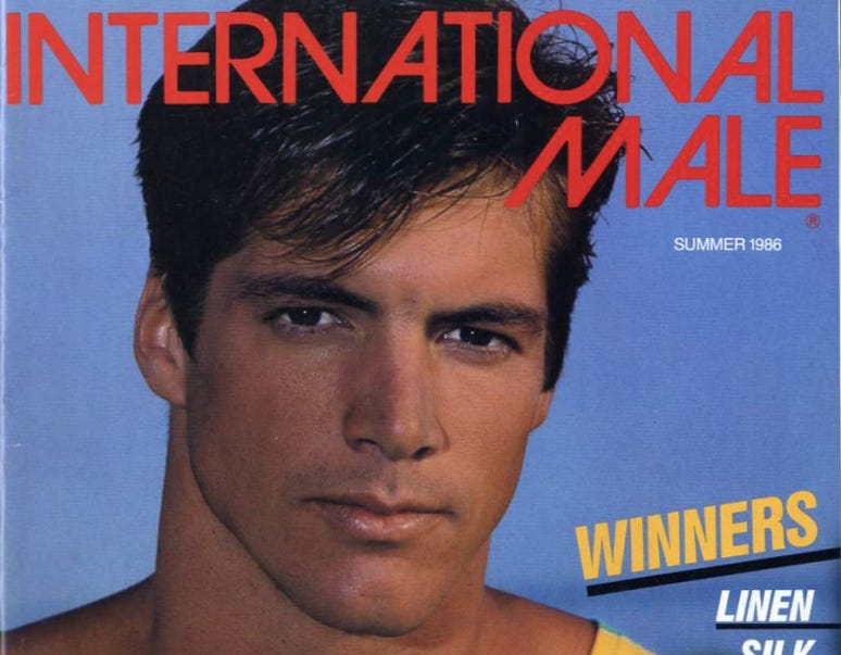 Tim: Dennis, I am so excited to talk to you. I'm sure you've heard this before, but as a closeted teen in the 1980s, I used to hide copies of International Male in my room and, uh, well I'm sure you can guess what I did with them. Particularly the Spring 1986 issue with dreamboat Robert Goold on the cover was my portal to all sorts of dirty dreams.